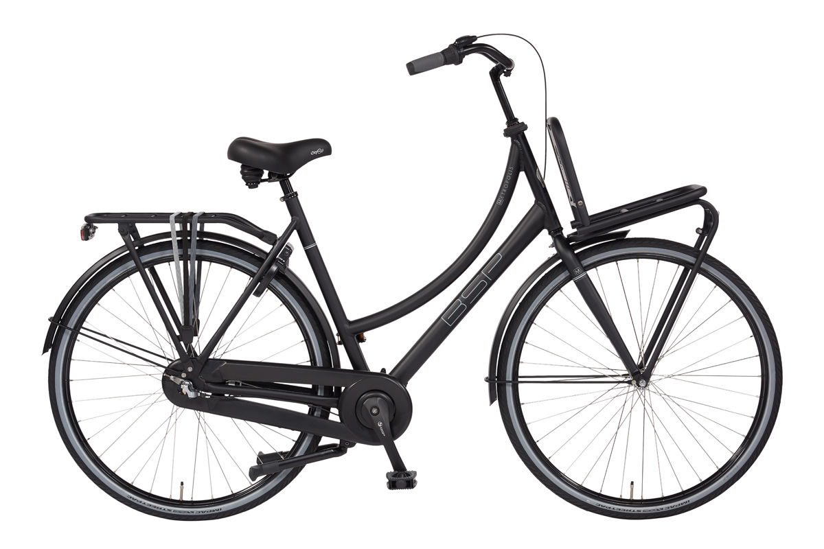 De BSP Metropolis Comfort is herkenbaar aan: stalen spatborden met massieve spatbordstangen, sterke harde kettingkast, 38mm brede transporterwielen, oversized dubbele poot standaard en oversized voordrager.